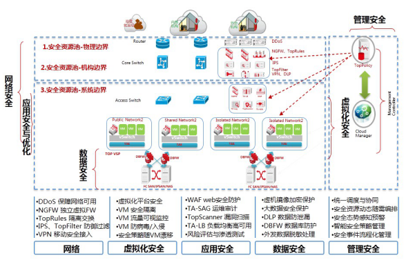 云安全等级保护方案突出了天融信在虚拟化安全方面的技术和产品优势,通过虚拟化的安全设备或安全资源池实现南北向防护与检测,通过虚拟化分布式防护系统对云主机进行东西向流量的防护与检测,通过云安全管理中心vSecCenter完成统一的策略管理、安全监控、策略迁移和自动化部署。运用多年积累的产品经验和虚拟化技术能力,结合云安全服务方面的技术优势,帮助用户按需构建自适应的云安全等级保护解决方案。